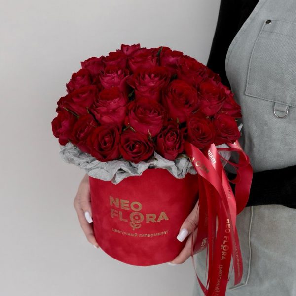 Классическая композиция из кенийских роз в шляпной коробке с фирменной лентой Neo Flora